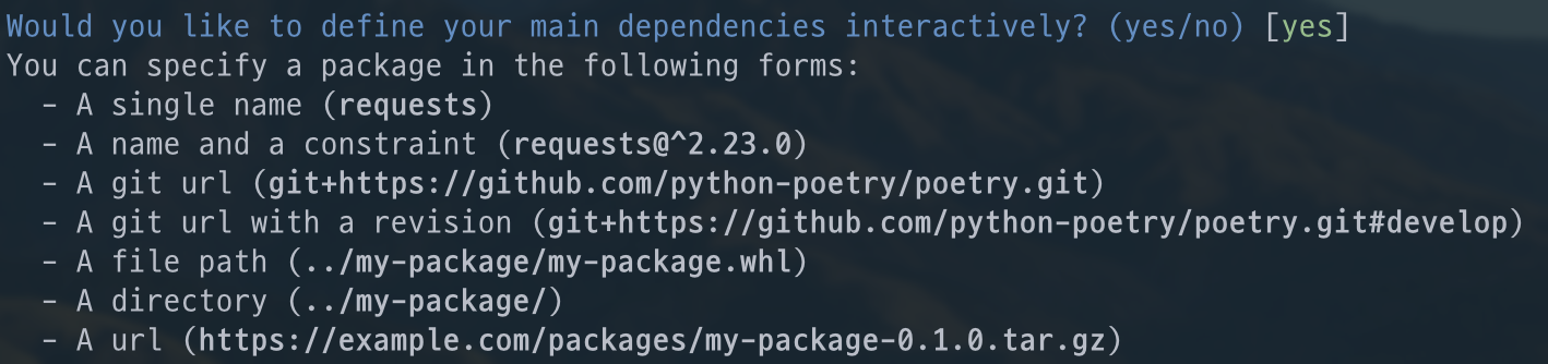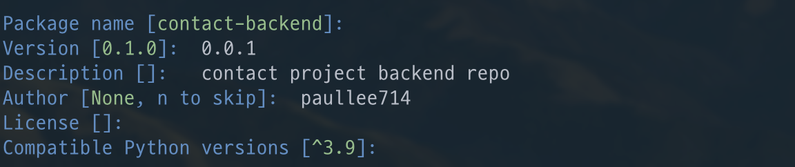 poetry init그럼, init에 필요한 여러가지들을 물어보는데 해당하는 파이썬 프로젝트의 특성에 맞게 적어주면 된다